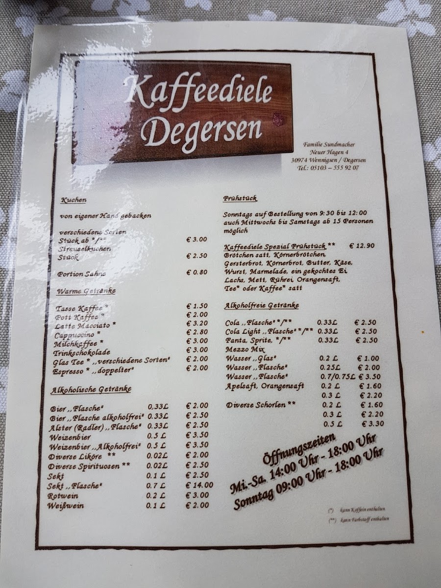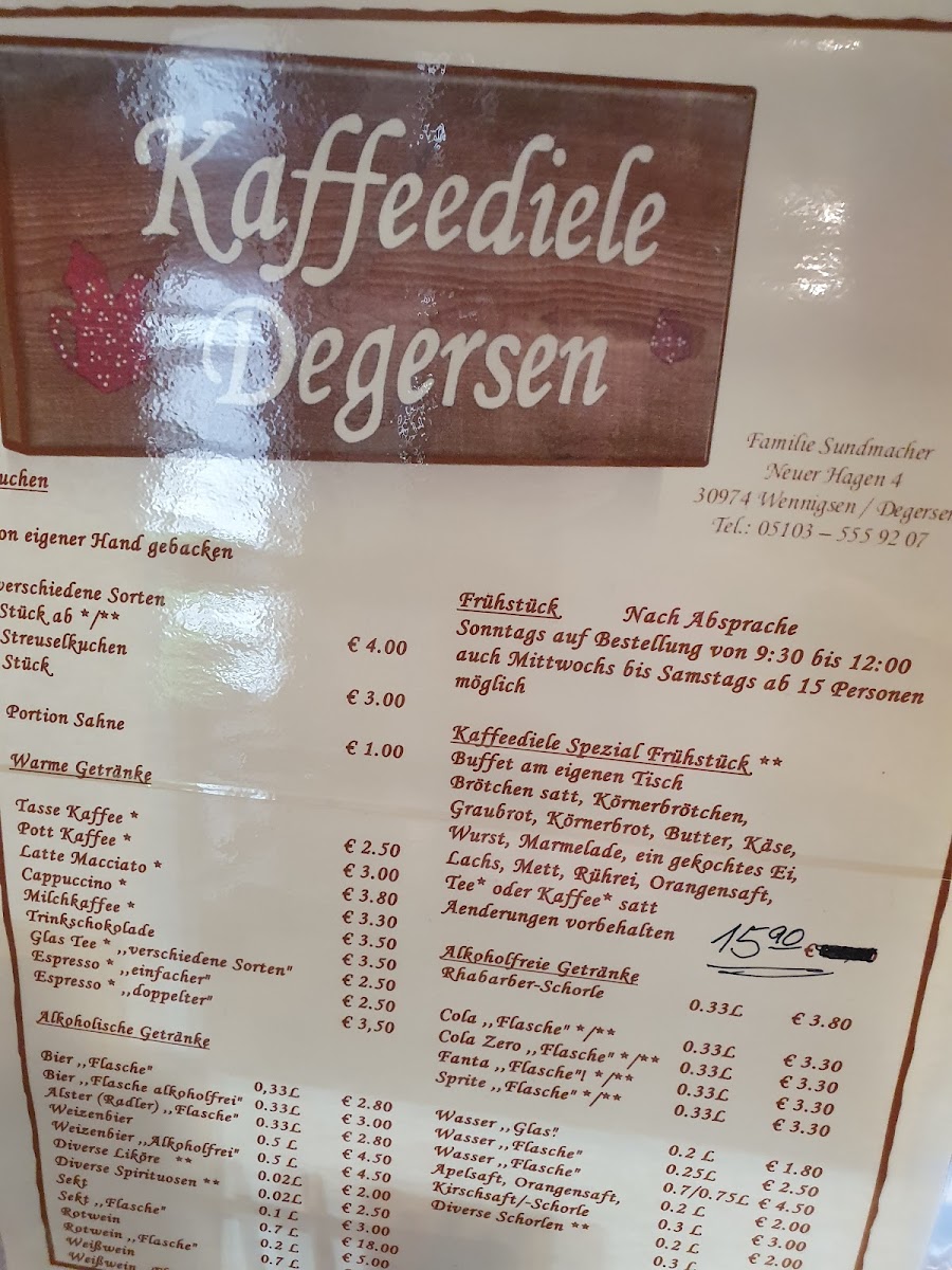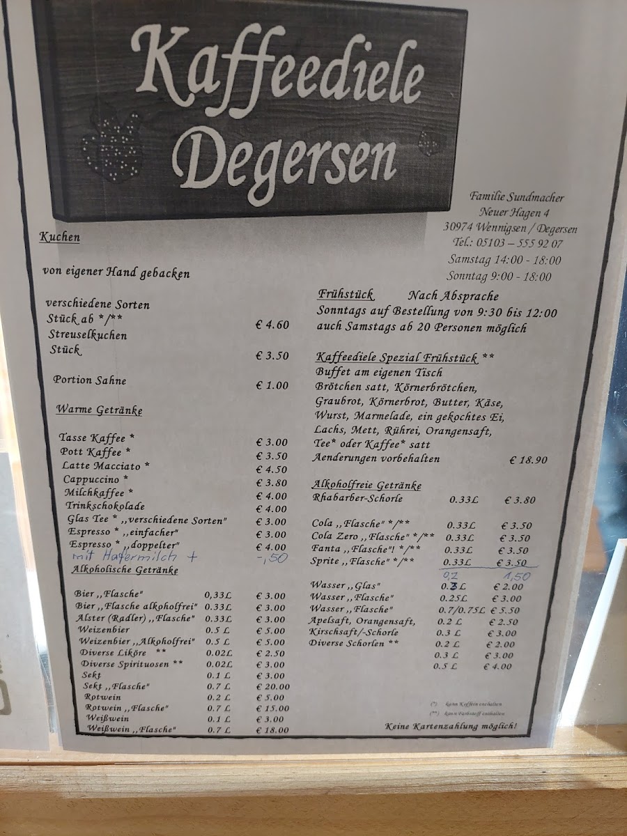 The menu at Kaffeediele Degersen primarily features a variety of freshly brewed coffees and warm beverages typical of a coffee shop and café setting. Visitors can expect a selection of sweet baked goods, including multiple types of homemade cakes and tortes such as Schoko-torte, Käsekuchen, Marzipan Mohn Torte mit Milchkaffee, Kirschsahnekuchen, Himbeertorte, as well as blueberry and apple-poppy seed options.